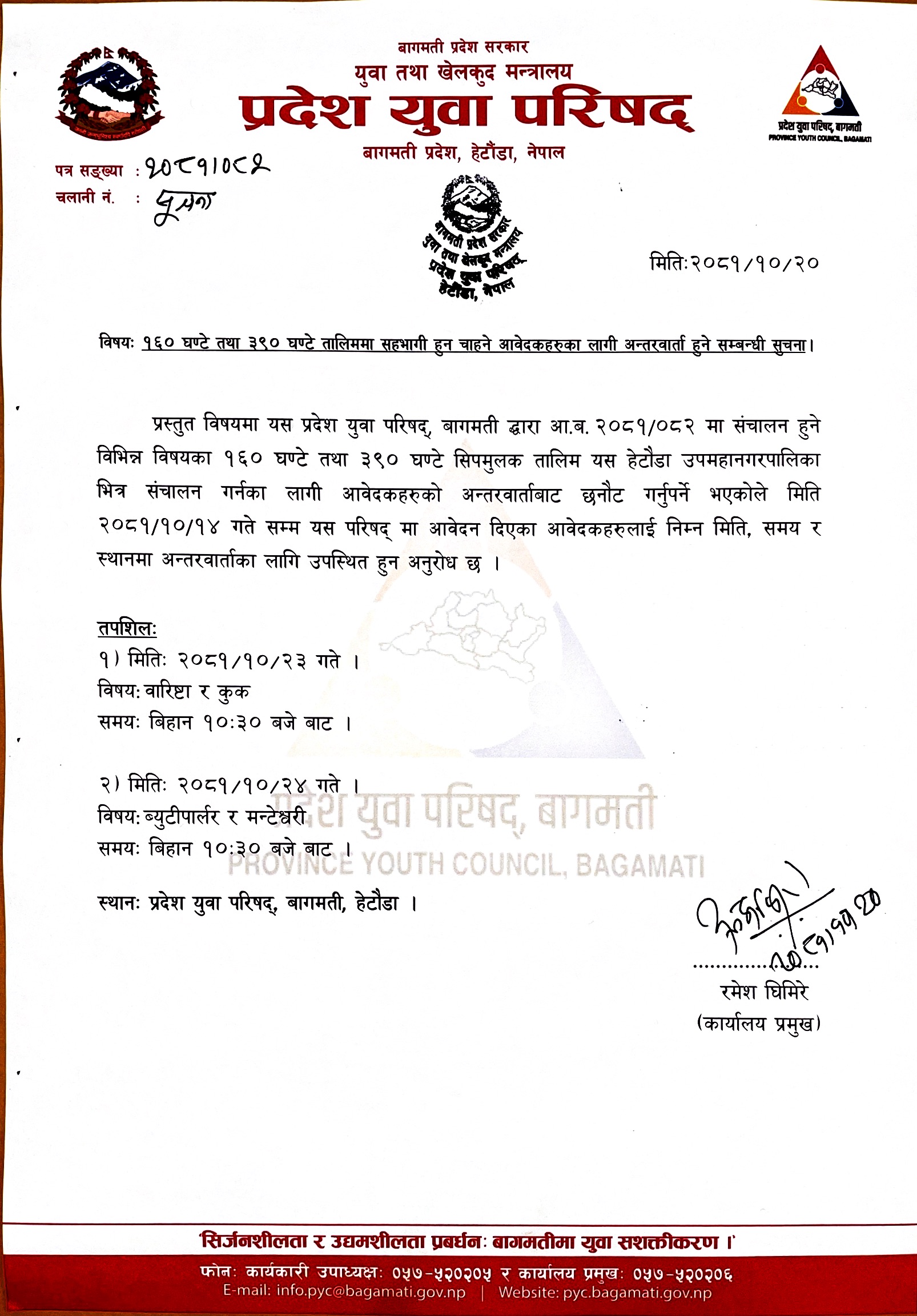 १६० घण्टे तथा ३९० घण्टे तालिममा सहभागी हुन चाहने आवेदकहरुका लागी अन्तरवार्ता हुने सम्बन्धी सुचना।