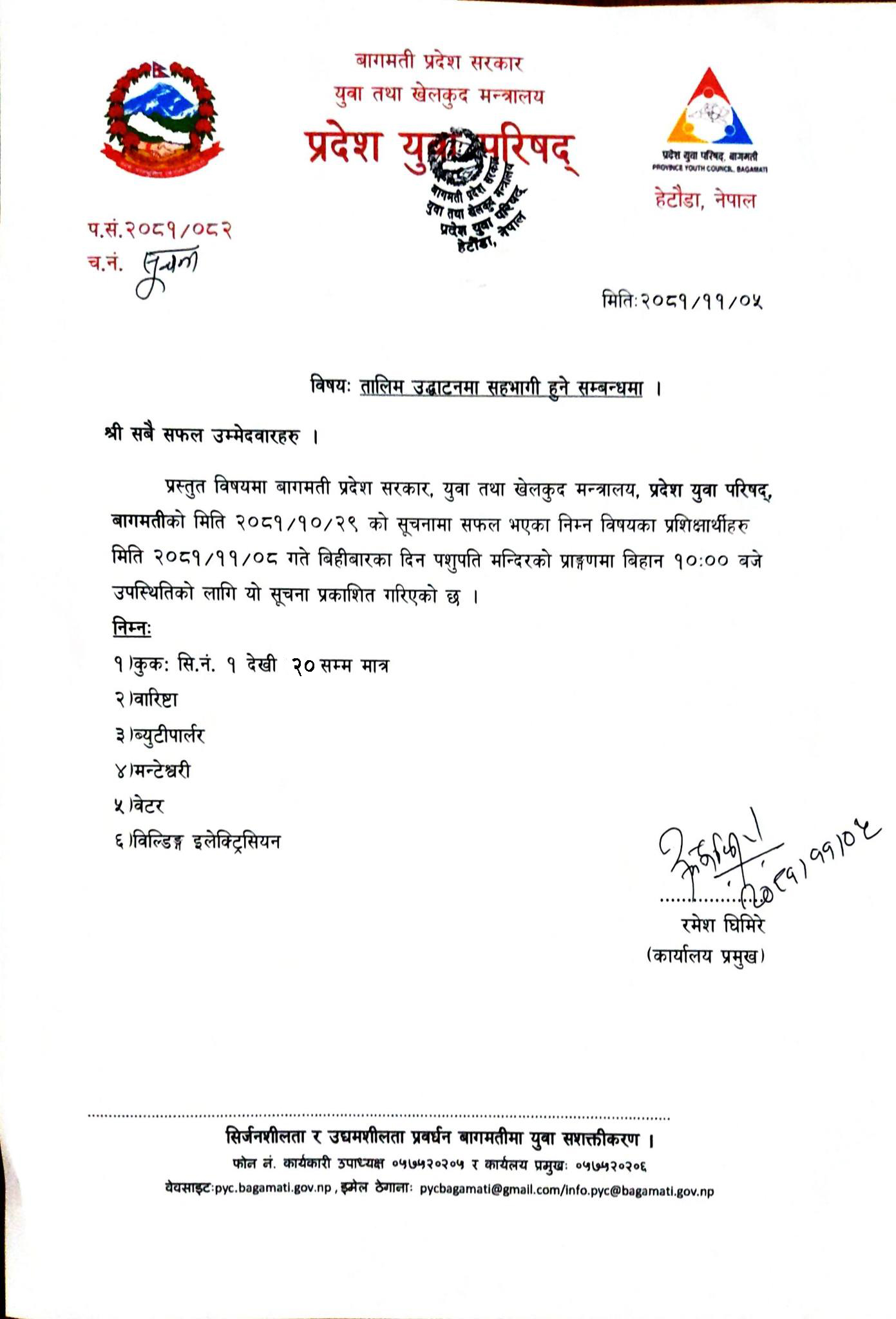 तालिम उद्धघाटनमा सहभागी हुने सम्बन्धी सूचना ।