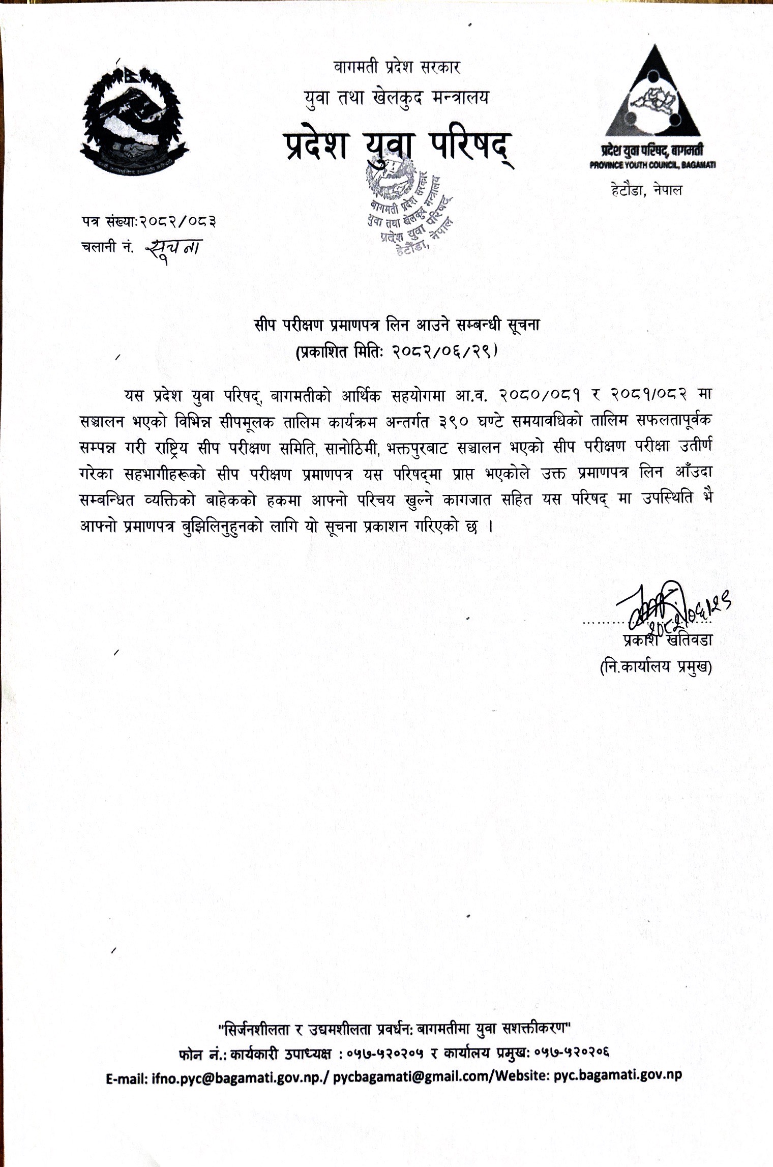 सीप परिक्षण प्रमाणपत्र लिन आउने सम्बन्धी सूचना ।