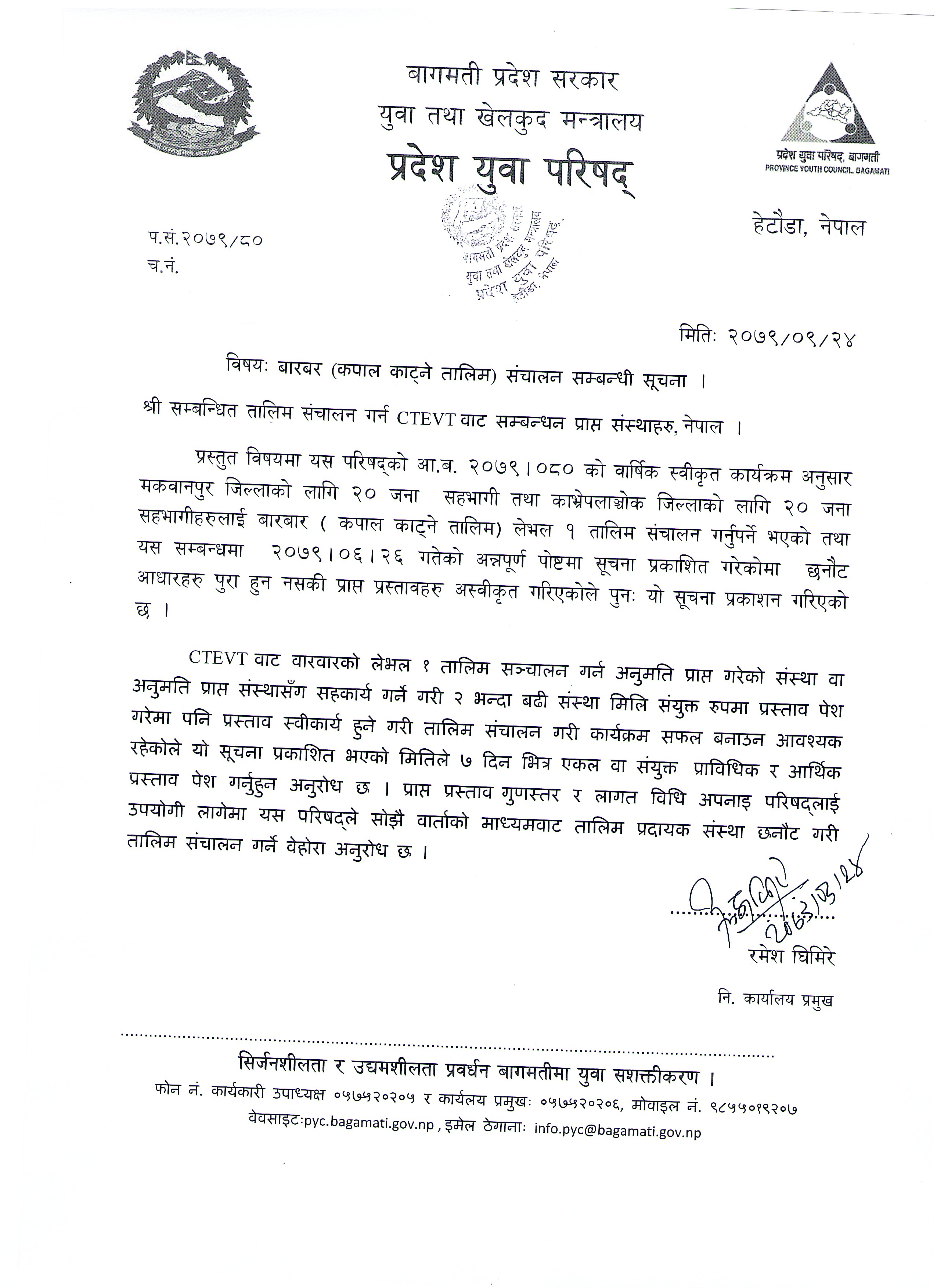 बारबार तालिम संचालनका लागि प्रस्ताव पेश गर्ने सूचना ।