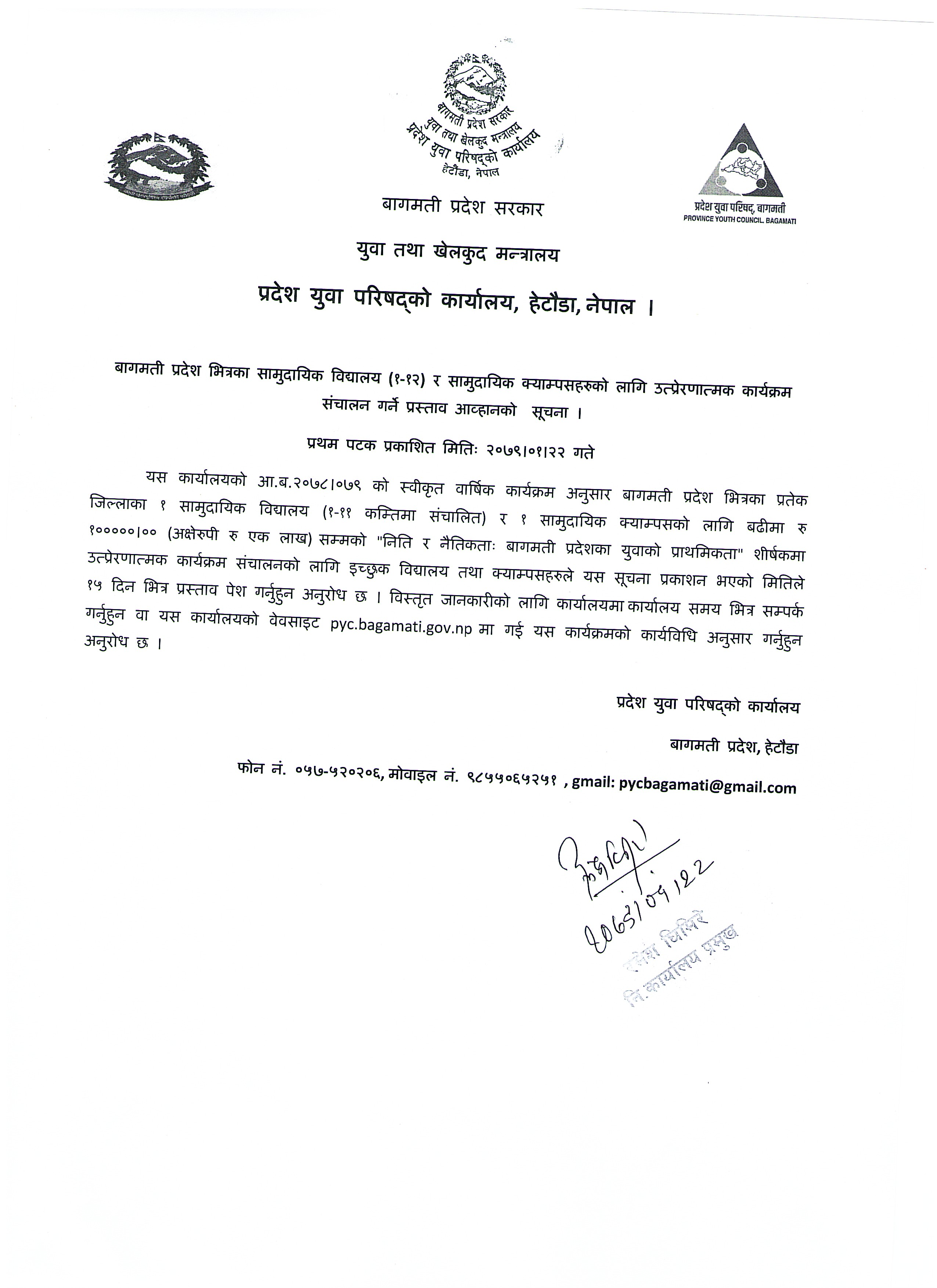 सामुदायिक क्याम्पस र सामुदायिक मा.वि. लाई निति र नैतिकता सम्बन्धी कार्यक्रमको प्रस्ताव पेश गर्ने सूचना ।