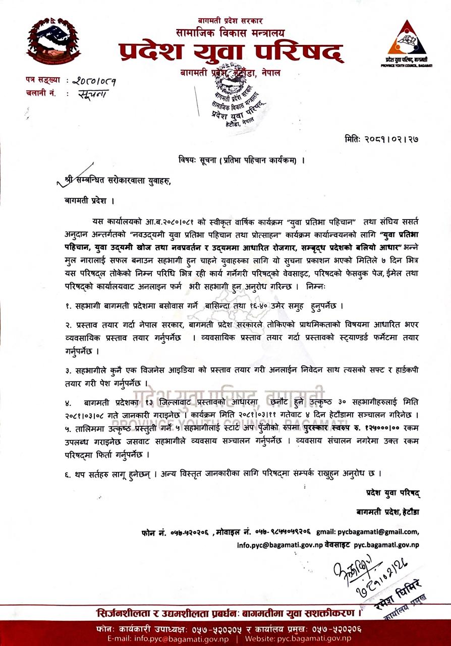 युवा प्रतिभा पहिचान कार्यक्रम सम्बन्धि सूचना