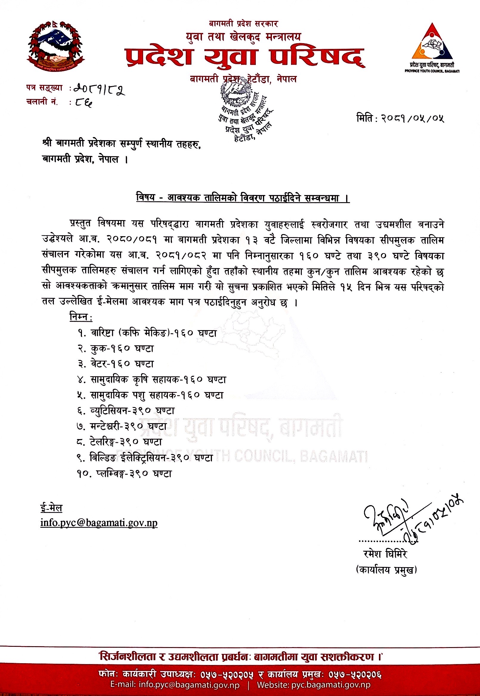 आवश्यक तालिमको विवरण पठाईदिने सम्वन्धमा ।